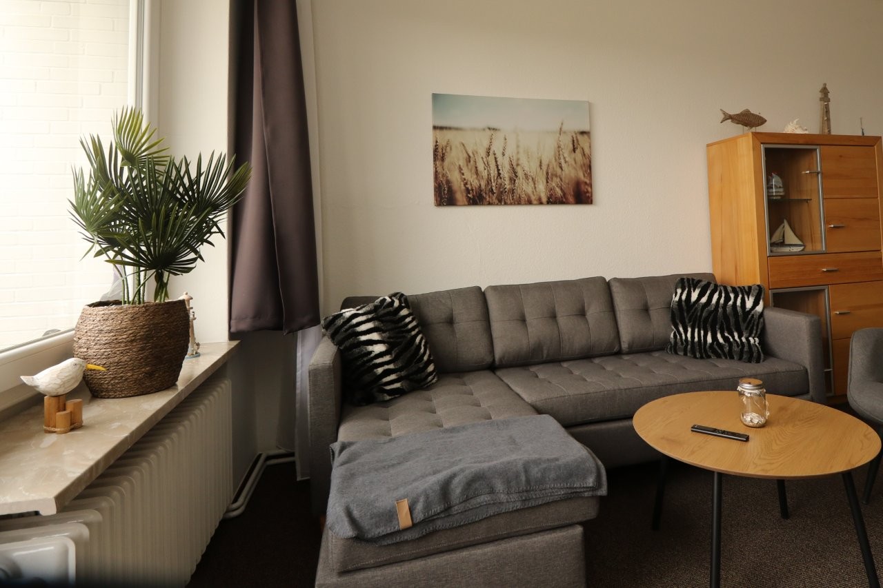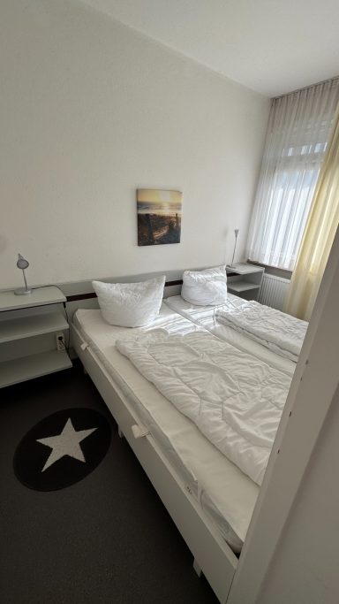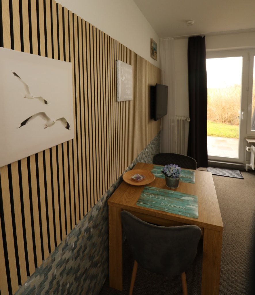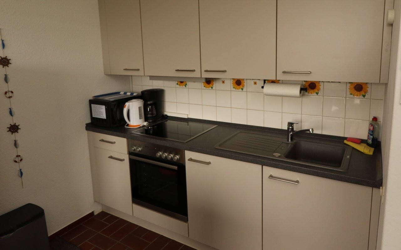 Vom Eingangsbereich aus, erreichen Sie das separate Schlafzimmer mit Doppelbett (1,80m breit x 1,90m lang), das separate Duschbad mit WC und den Wohnbereich mit offener Küche und Essbereich. Im Wohnbereich des kleinen und funktional eingerichteten Appartements befindet sich eine gemütliche Sitzgruppe sowie ein Esstisch.